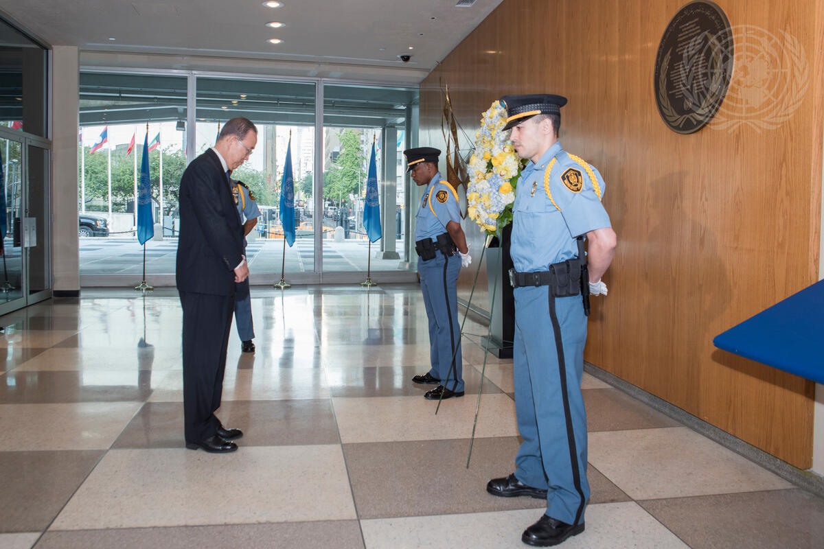 Secretary-General Ban Ki-moon (left) during a wreath-laying ceremony to commemorate the twelfth anniversary of the 2003 bombing of the UN headquarters in Baghdad that killed 22 people, including UN envoy Sergio Vieira de Mello. The anniversary day, 19 August, is now observed annually as World Humanitarian Day.