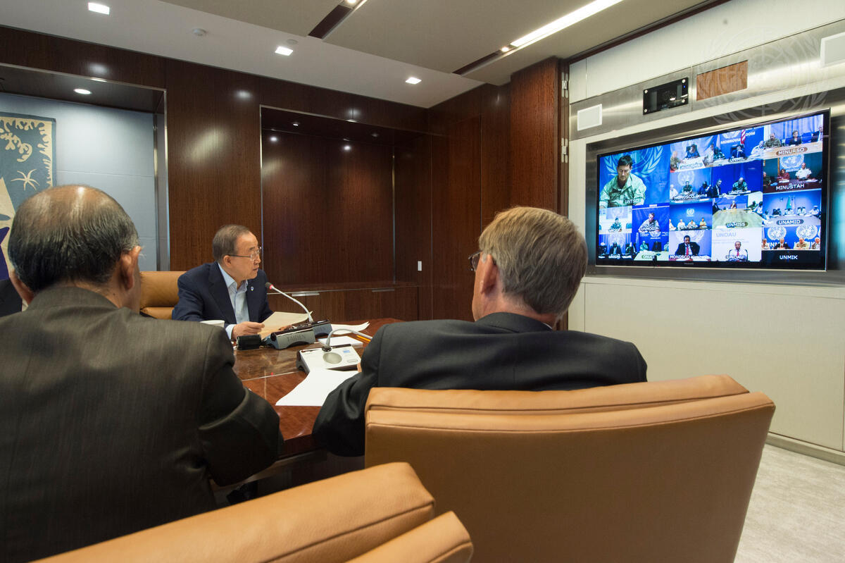 Secretary-General Ban Ki-moon (centre) convenes a video conference with his Special Representatives, Force Commanders and Police Commissioners in all UN peacekeeping operations to underscore the leaders' responsibility with regards to misconduct of peacekeepers under their command. Also taking part in the meeting: Atul Khare (left, back to camera), Under-Secretary-General for Field Support; and Deputy Secretary-General Jan Eliasson (right, back to camera).