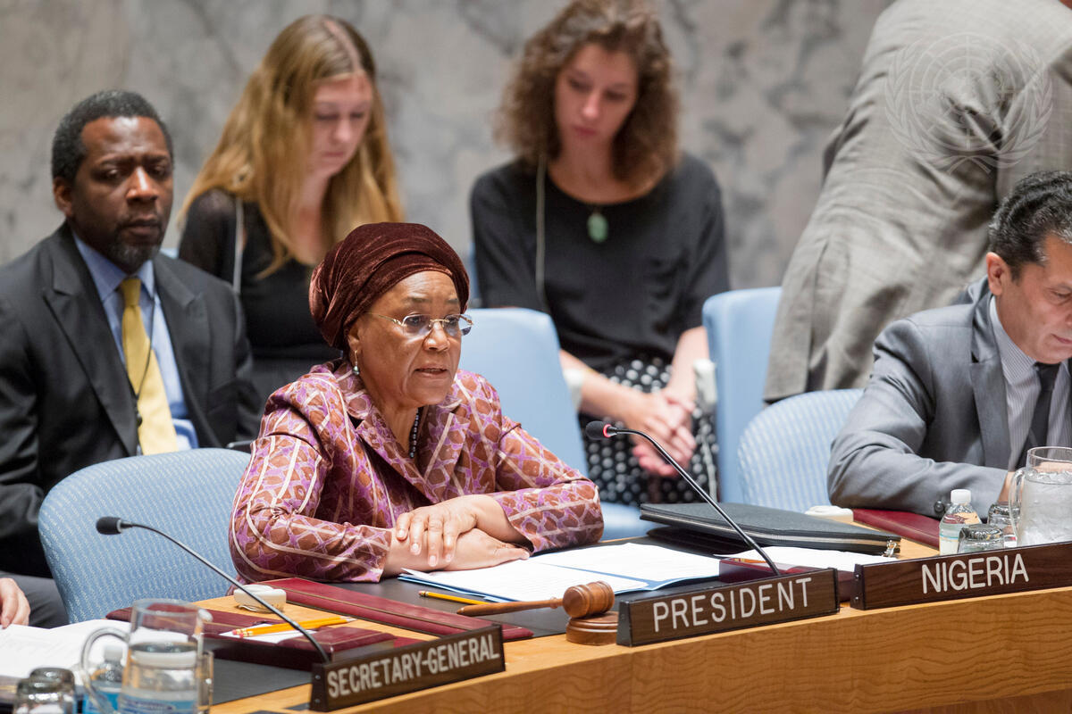 U. Joy Ogwu (front left), Permanent Representative of Nigeria to the UN and President of the Security Council for August, chairs the Council’s open debate on the role of regional organizations in meeting the contemporary challenges of global security.