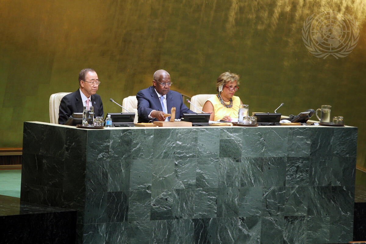 Sam Kutesa (centre), President of the Assembly’s sixty-ninth session, chairs the meeting. He is flanked by Secretary-General Ban Ki-moon (left) and Catherine Pollard, Assistant Secretary-General for General Assembly and Conference Management.