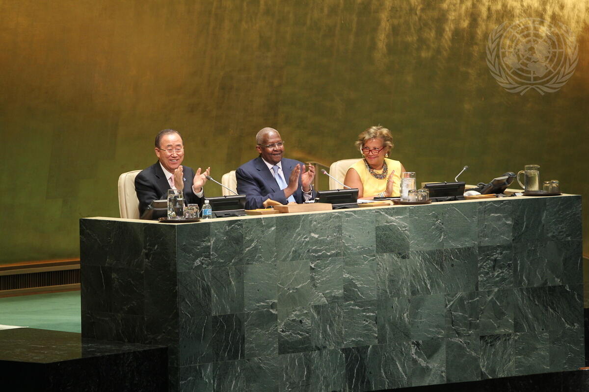 Sam Kutesa (centre), President of the Assembly’s sixty-ninth session, applauds the decision, along with Secretary-General Ban Ki-moon (left) and Catherine Pollard, Assistant Secretary-General for General Assembly and Conference Management.