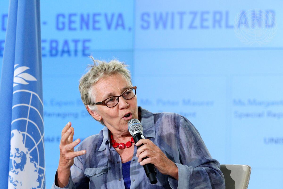 Nan Buzard, Executive Director of the International Council of Voluntary Agencies (ICVA), speaks during a panel discussion on how the Sustainable Development Goals, expected to be adopted by the General Assembly in September, will impact humanitarian work and response. The discussion took place as part of the observance of World Humanitarian Day (19 August) by the UN Office at Geneva (UNOG).