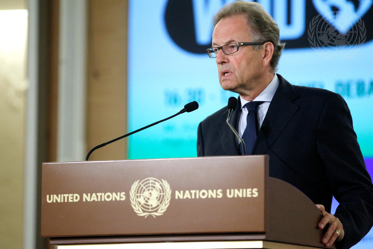 Michael Møller, Director-General of the United Nations Office at Geneva (UNOG), speaks during an event at the Palais des Nations marking World Humanitarian Day (19 August).