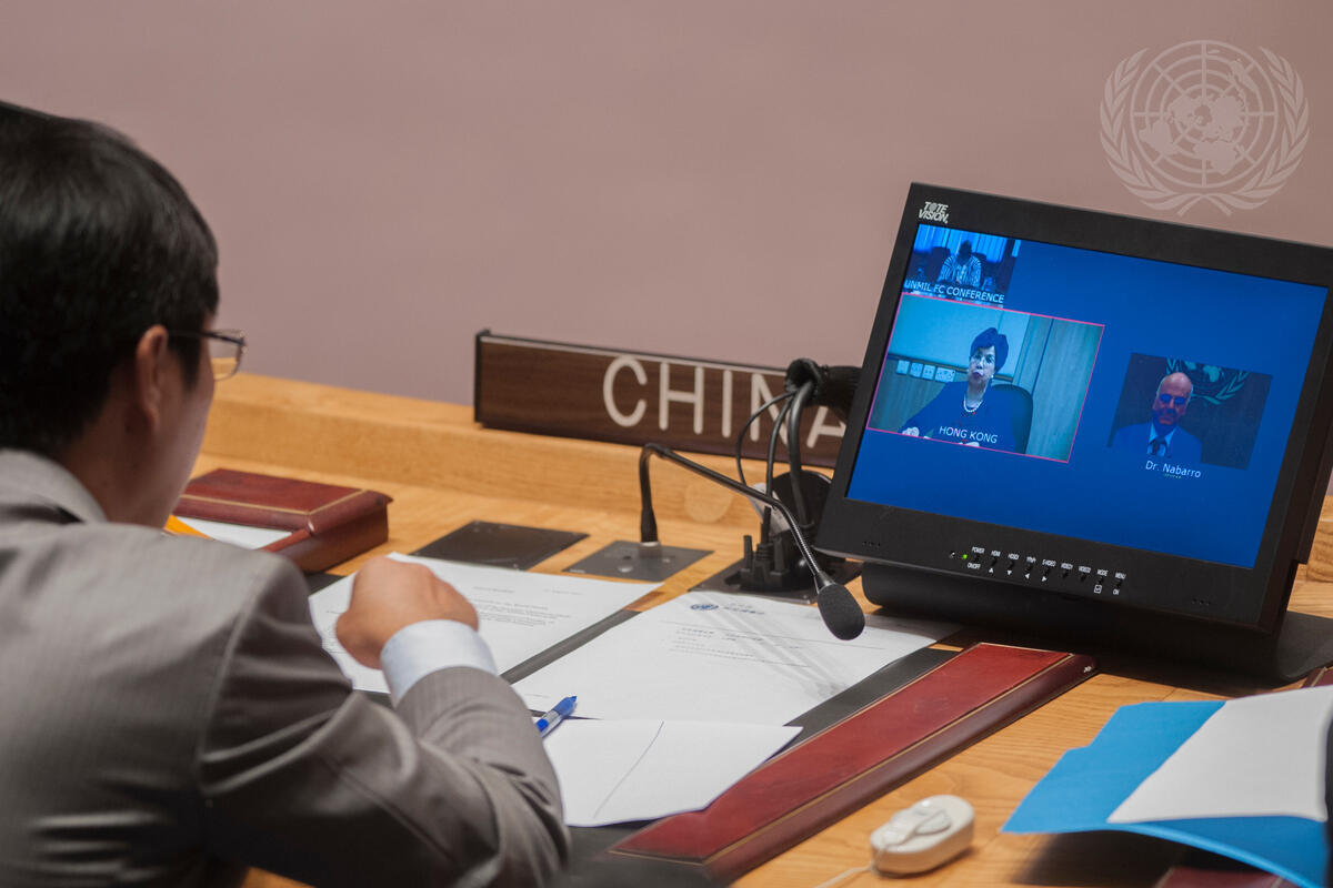 Margaret Chan (lower left on screen), Director-General of the World Health Organization (WHO), speaking via video conference from Hong Kong, briefs the Security Council on the global response to the 2013 Ebola virus disease outbreak in West Africa. The Council also heard from David Nabarro, Special Envoy of the Secretary-General on Ebola, speaking from Geneva; and Mosoka Fallah, Coordinator of the Montserrado Community Based Initiative Project (MCBIP), speaking from Monrovia.