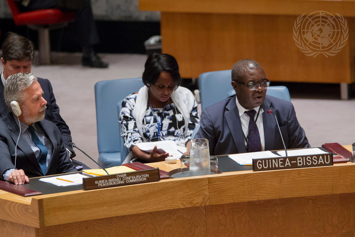 Joao Soares Da Gama (right), Permanent Representative of the Republic of Guinea-Bissau to the UN, addresses the Security Council meeting on the situation in his country. At left is Antonio de Aguiar Patriota, Permanent Representative of Brazil to the UN and Chair of the Guinea-Bissau Configuration of the Peacebuilding Commission.