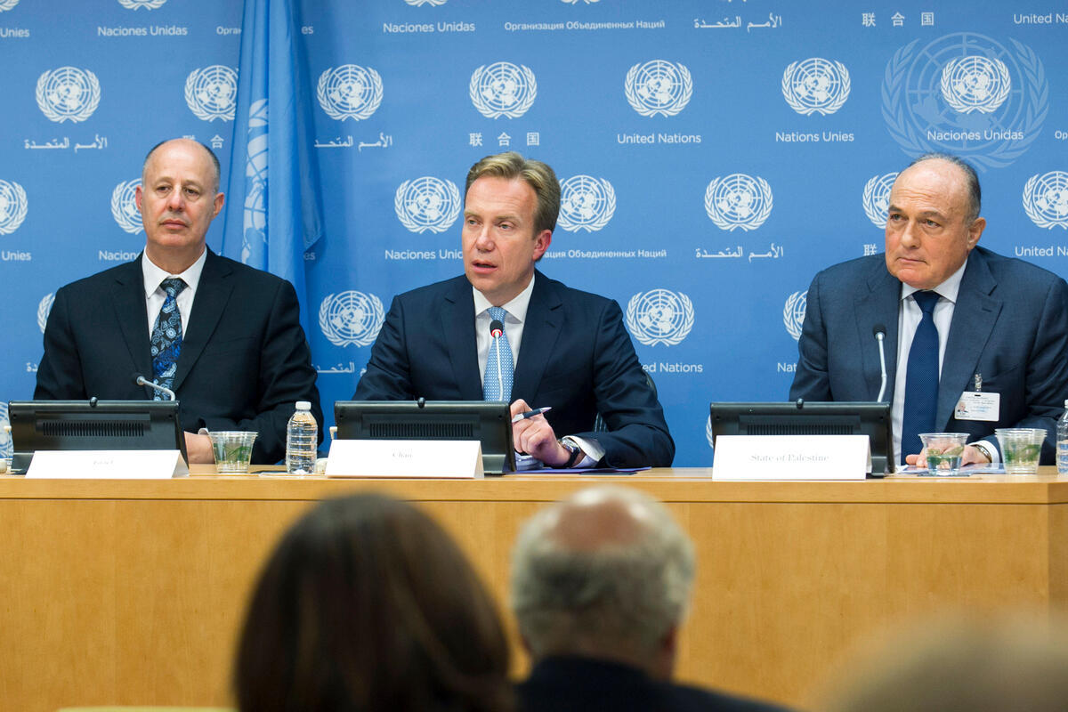 Børge Brende (centre), Chair of the Donor Group for Palestine and Minister for Foreign Affairs of Norway, speaks at a press conference following the ministerial meeting of the Donor Group for Palestine. Mr. Brende is flanked by Tzachi Hanegbi (left), Deputy Minister for Foreign Affairs of Israel, and Shukry Bishara, Minister for Finance of the State of Palestine.