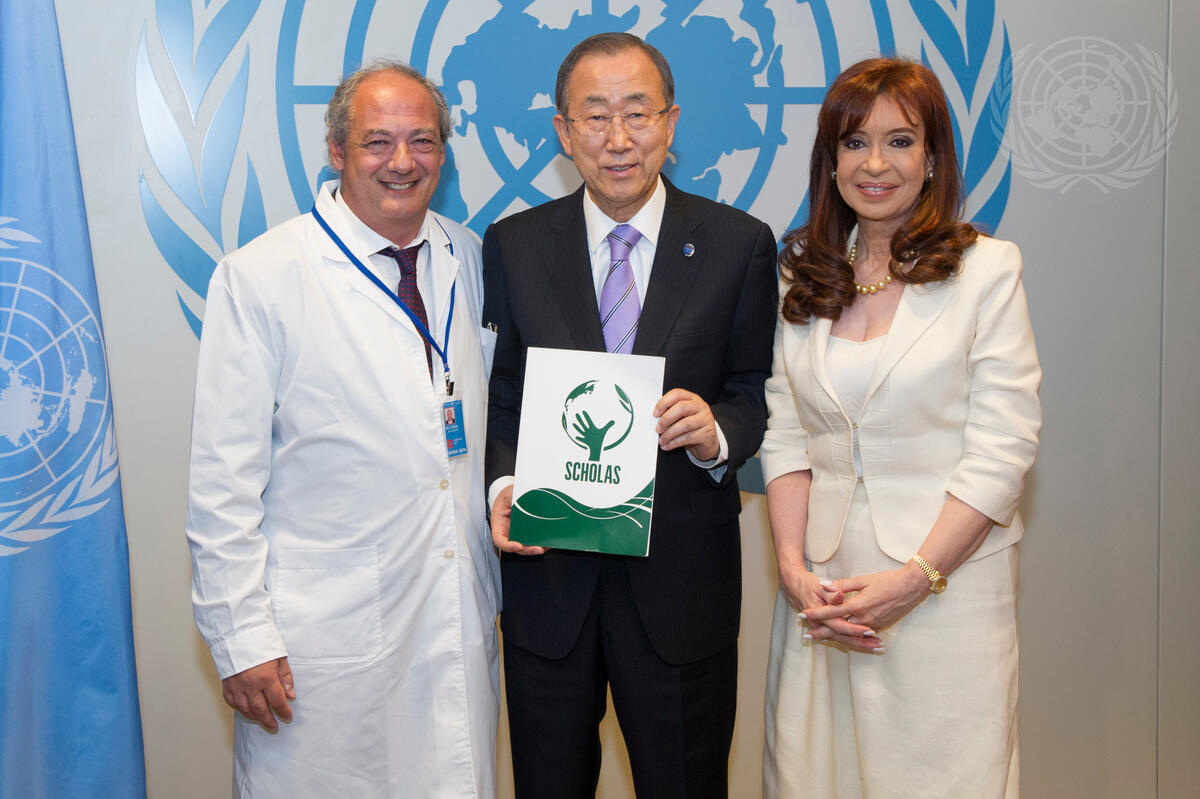 Secretary-General Ban Ki-moon (centre) meets with Cristina Fernández, President of Argentina, and José María del Corral, educator and Director of Scholas Occurrentes.
