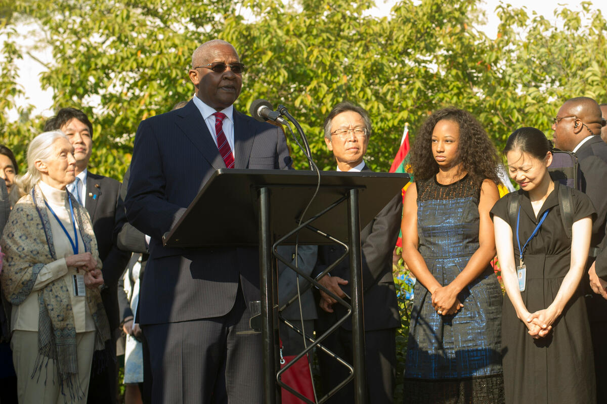 Sam Kahamba Kutesa (second from left), President of the sixty-ninth session of the General Assembly, speaks at the annual Peace Bell Ceremony held in observance of the International Day of Peace (21 September). The theme of this year’s International Day of Peace is ""Right of Peoples to Peace"" in honour of the 30th anniversary of the General Assembly Declaration on the Right of Peoples to Peace. Also pictured, from left: UN Messenger of Peace Jane Goodall; Motohide Yoshikawa, Permanent Representative of Japan to the United Nations; UN Foundation Girl Up Champion Monique Coleman; and UN Messenger of Peace Midori Goto.