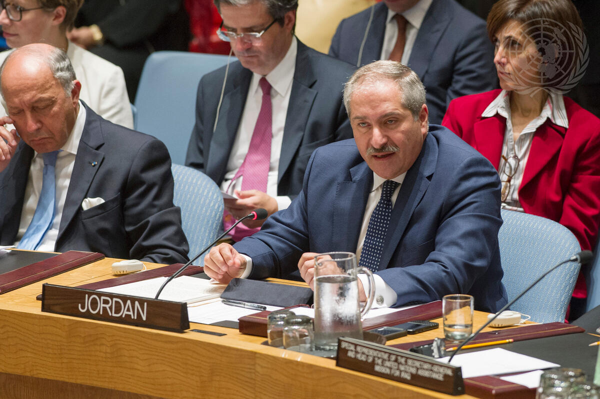 Nasser Judeh (right), Minister for Foreign and Expatriates Affairs of the Hashemite Kingdom of Jordan, addresses the Security Council meeting on the situation concerning Iraq. On his right is Laurent Fabius, Minister for Foreign Affairs of France.