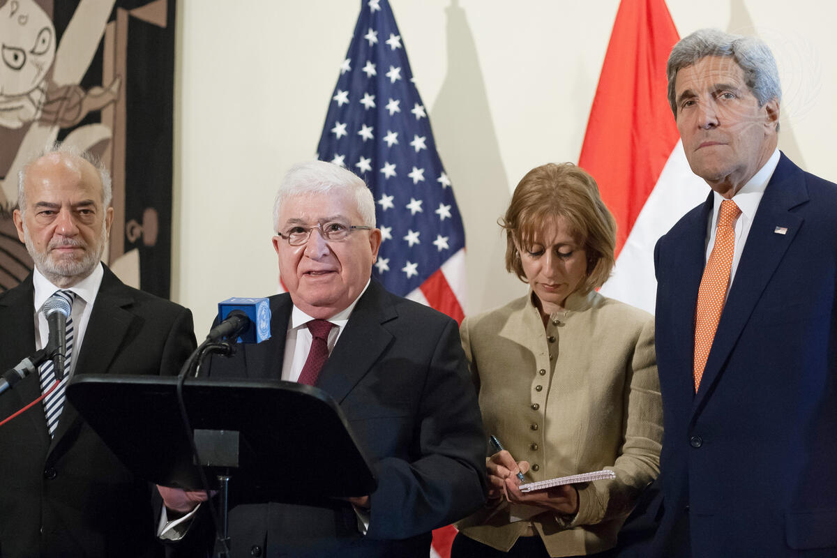 Mohammed Fuad Masum (centre), President of Iraq, jointly speaks to journalists with United States Secretary of State John Kerry (right) and Ibrahim Al-Jaafari (left), Minister for Foreign Affairs of Iraq.