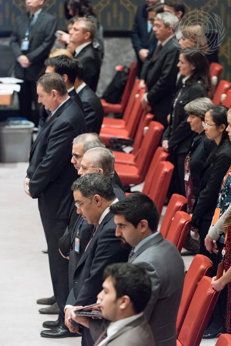 A view of the delegates at the Security Council meeting observing a moment of silence for the victims of the terrorist attacks in Beirut on 12 November and in various locations in Paris on 13 November.