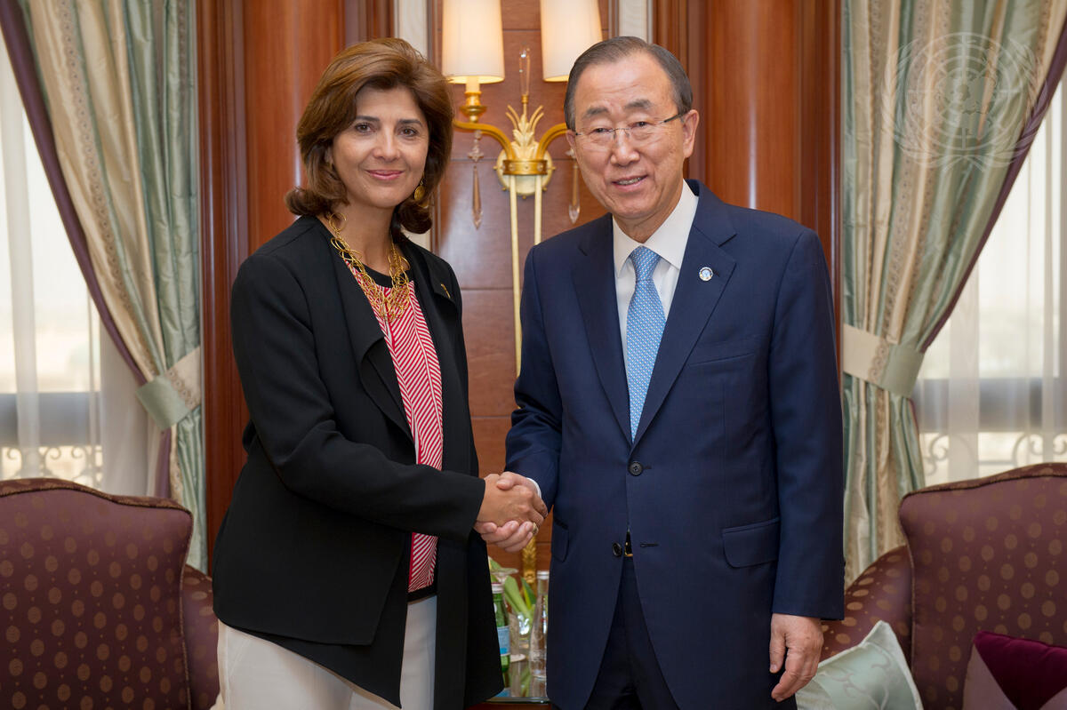 Secretary-General Ban Ki-moon (right) meets with María Ángela Holguín Cuéllar, Minister for Foreign Affairs of Colombia, in Riyadh, Saudi Arabia.