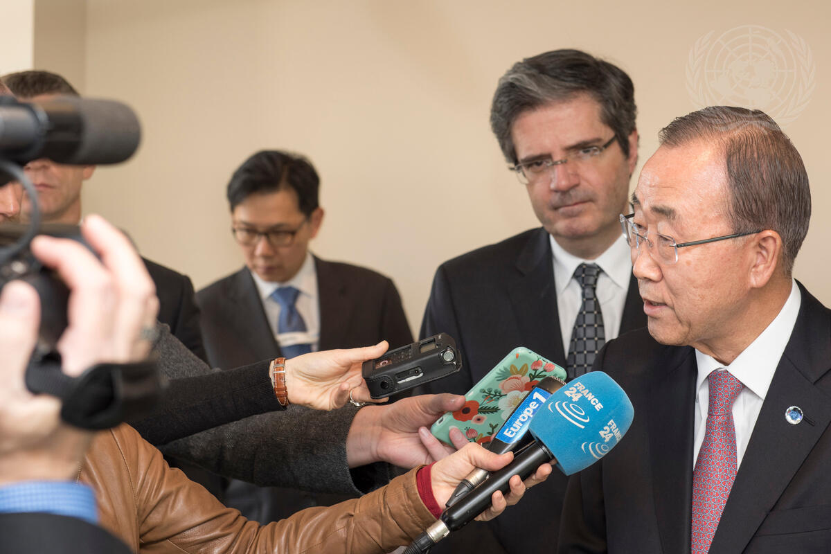The Secretary-General (right) speaks to journalists, with François Delattre, Permanent Representative of France to the UN, at his side.