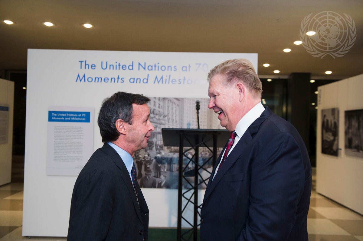 Sebastiano Cardi (left), Permanent Representative of Italy to the UN, with Kelvin Miller, Corporate Vice-President of Lifetouch, at the opening of two photo exhibits --“The United Nations at 70: Moments and Milestones” and “UN Headquarters: A Workshop for Peace”. The exhibits feature a selection of iconic images and historical documents showcasing key moments from 70 years of United Nations history, as well as an overview of the planning and building of UN Headquarters and photos of the recently renovated compound. The event was organized by the Department of Public Information (DPI) and UN Archives in collaboration with the International Photographic Council (IPC), Lifetouch and the Permanent Mission of Italy.