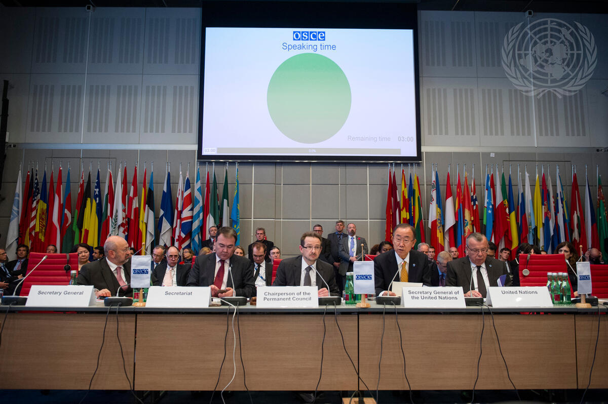 Secretary-General Ban Ki-moon (second from right) addresses the the Permanent Council of the Organization for Security and Co-operation in Europe (OSCE). He is flanked by Thomas Greminger (left), Chairperson of the Council; and Yury Fedotov, Director-General of the UN Office in Vienna (UNOV) and Executive Director of the UN Office on Drugs and Crime (UNODC).