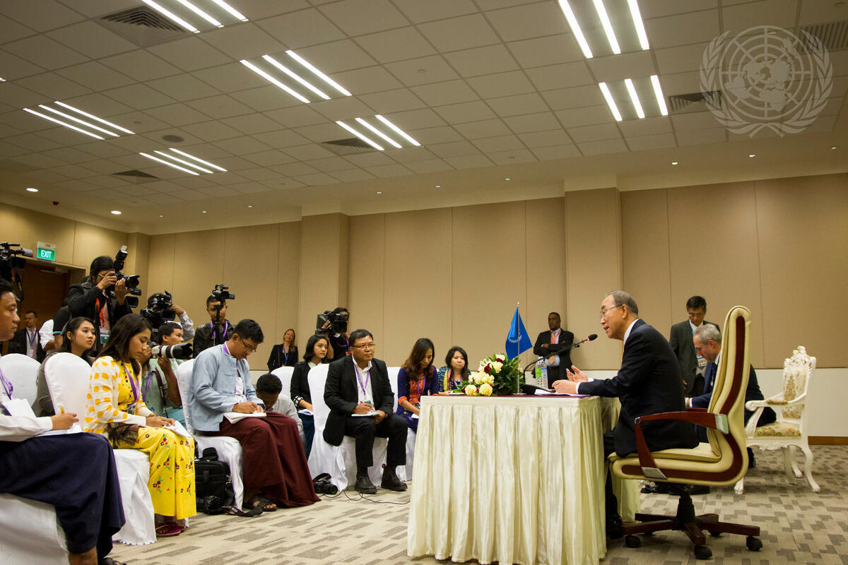 Secretary-General Ban Ki-moon (seated at table) addresses members of the local media in Myanmar, during his trip to the country to attend the Association of Southeast Asian Nations (ASEAN) Summit.