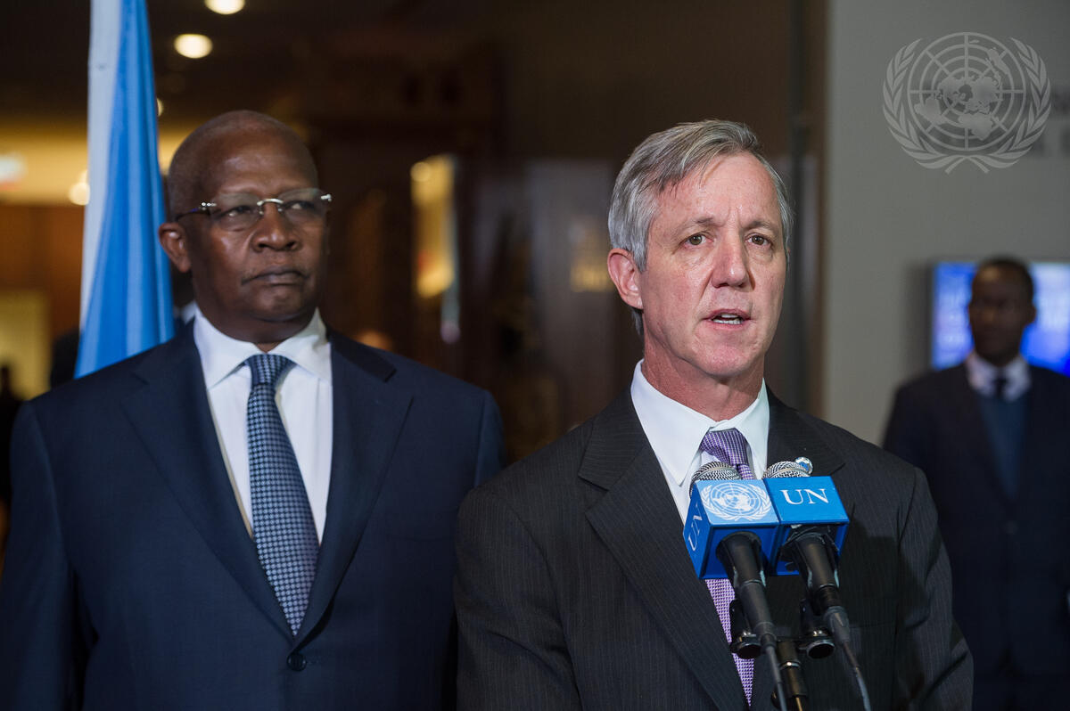 Anthony Banbury (right), Special Representative of the Secretary-General and Head of the UN Mission for Ebola Emergency Response (UNMEER), speaks to journalists following his briefing to the General Assembly on the public health crisis emanating from the Ebola virus outbreak in West Africa. Pictured with him: Sam Kahamba Kutesa, President of the sixty-ninth session of the Assembly.