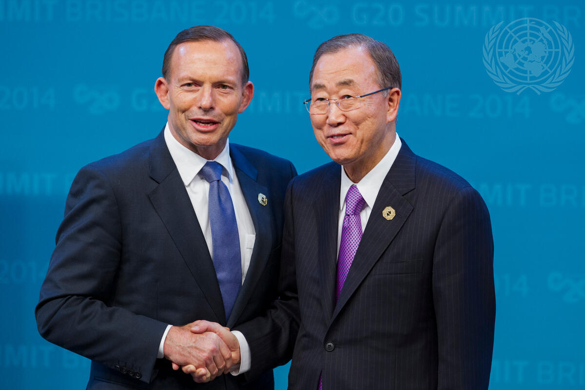 Tony Abbott, Prime Minister of Australia (left), greets Secretary-General Ban Ki-moon at the 2014 G20 Leaders’ Summit, being held on 15-16 November in Brisbane, Queensland, Australia at the Brisbane Convention and Exhibition Centre.