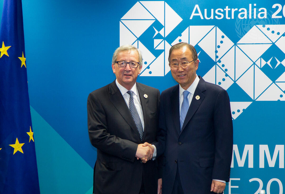 Secretary-General Ban Ki-moon (right), meets with Jean-Claude Juncker, President of the European Commission, on the margins of the 2014 G20 Leaders’ Summit. This year’s Summit is being held on 15-16 November in Brisbane, Queensland, Australia at the Brisbane Convention and Exhibition Centre.