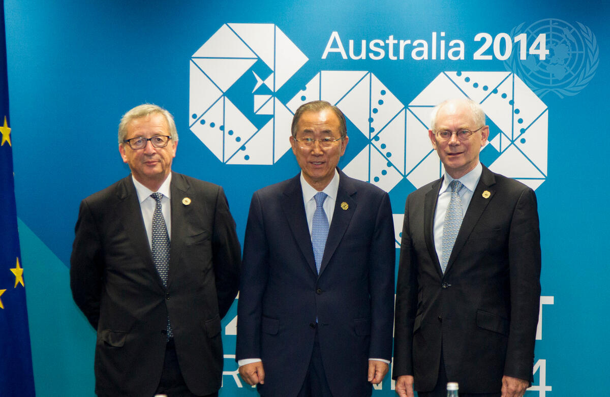 Secretary-General Ban Ki-moon (centre), meets with Herman Van Rompuy (right), President of the European Council, and Jean-Claude Juncker, President of the European Commission, on the margins of the 2014 G20 Leaders’ Summit. This year’s Summit is being held on 15-16 November in Brisbane, Queensland, Australia at the Brisbane Convention and Exhibition Centre.