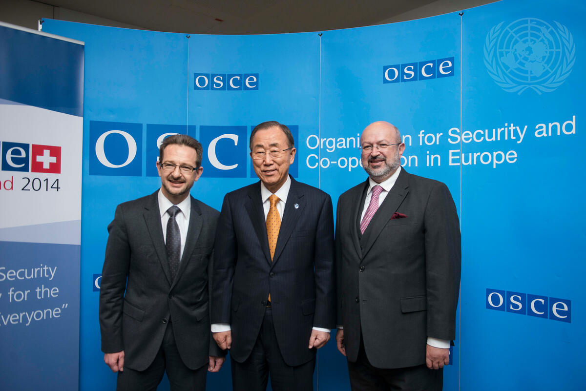 Secretary-General Ban Ki-moon (centre) meets with Thomas Greminger (left), Chairperson of the Permanent Council of the Organization for Security and Co-operation in Europe (OSCE); and Lamberto Zannier, Secretary General of the OSCE.