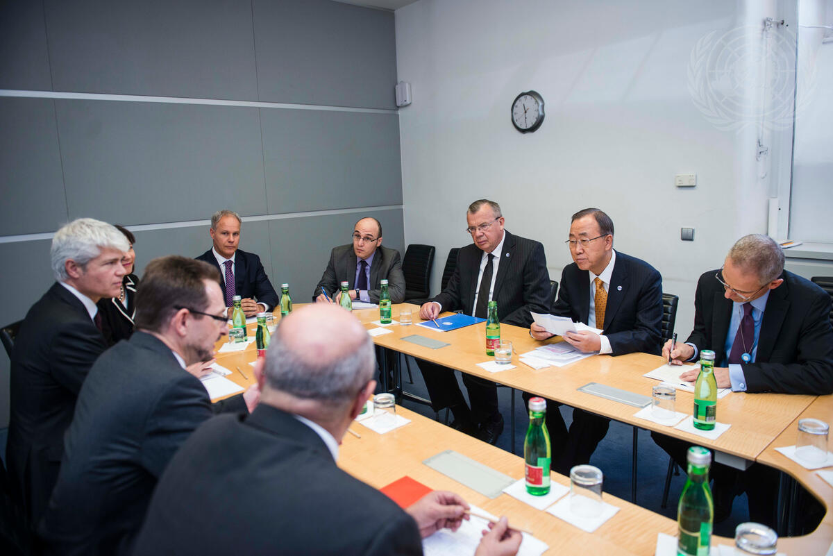 Secretary-General Ban Ki-moon (second from right) meets with Lamberto Zannier (back nearest to camera), Secretary General of the Organization for Security and Co-operation in Europe (OSCE), and Thomas Greminger (Mr. Zannier’s left), Chairperson of the OSCE Permanent Council. Mr. Ban is flanked by Yury Fedotov (left of Mr. Ban), Director-General of the UN Office in Vienna (UNOV) and Executive Director of the UN Office on Drugs and Crime (UNODC), and Martin Nesirky (right), Director of the UN Information Service (UNIS) in Vienna.