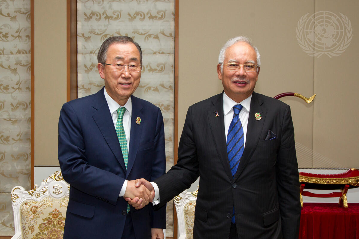 Secretary-General Ban Ki-moon (left) meets with Dato' Sri Mohd Najib bin Tun Haji Abdul Razak, Prime Minister of Malaysia, at the margin of the Summit of the Association of Southeast Asian Nations (ASEAN) in Myanmar’s capital, Nay Pyi Taw.