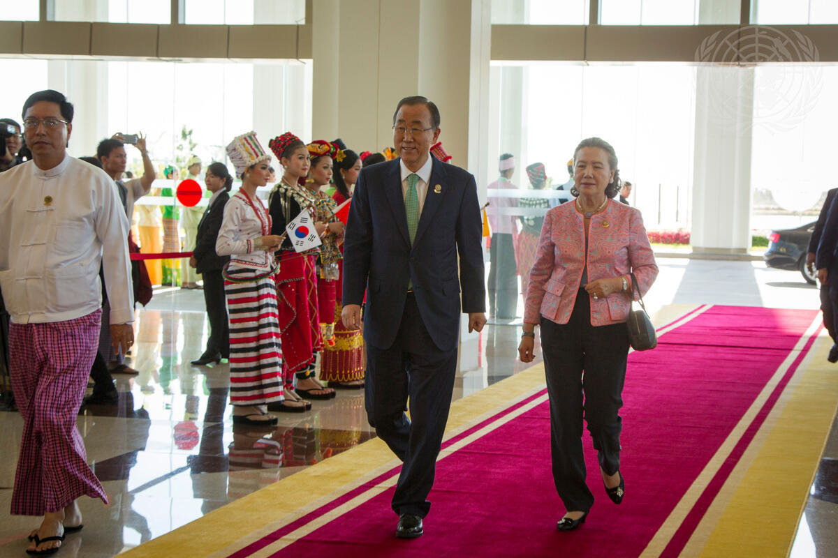 Secretary-General Ban Ki-moon (left) and his wife Yoo Soon-taek (right) arrive for the opening of the 25th Summit of the Association of Southeast Asian Nations (ASEAN), hosted by Myanmar.