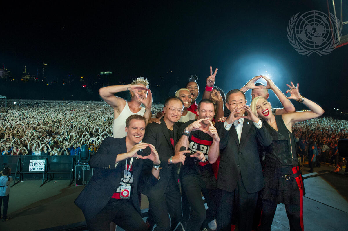 Secretary-General Ban Ki-moon (front row, second from right) takes a group photo with performers and organizers at the third annual Global Citizen Festival, initiated by the Global Poverty Project. Also in the front row are, from left: Global Citizen Project Co-founder Hugh Evans; World Bank President Jim Yong Kim, actor Hugh Jackman, and Gwen Stefani, lead singer of the musical group No Doubt (pictured in the second row.)