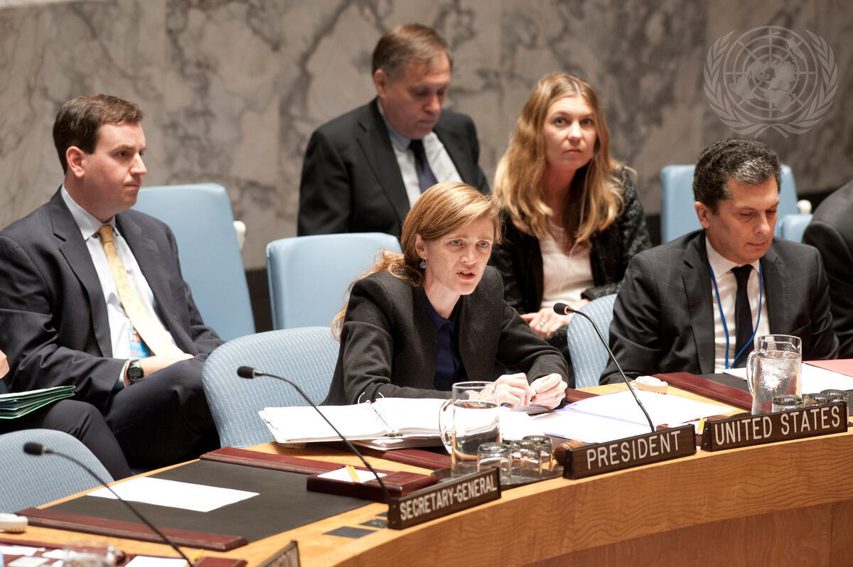 Samantha Power (centre), Permanent Representative of the United States to the UN and President of the Security Council for the month of September, addresses the Council meeting on the situation in the Middle East.
