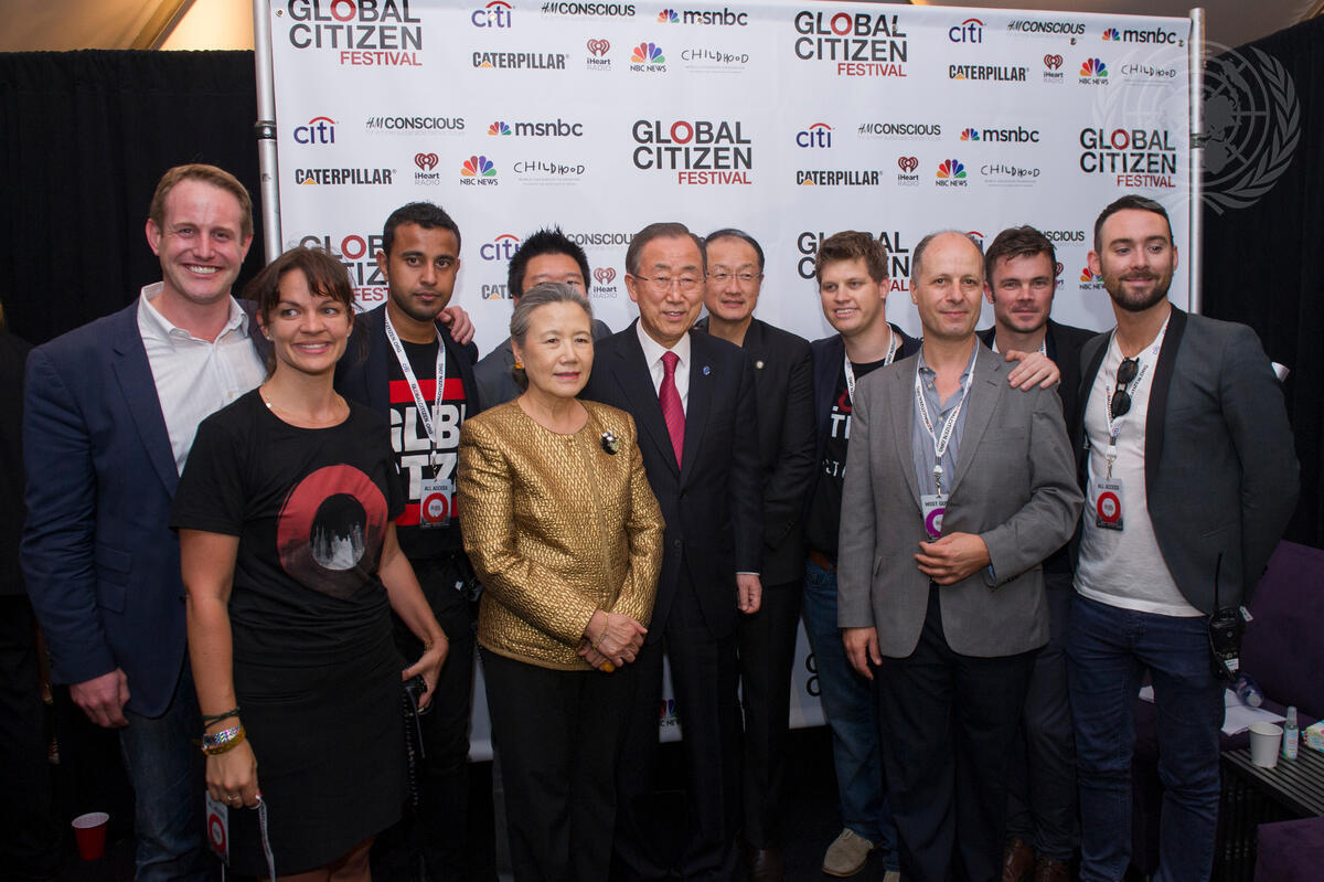 Secretary-General Ban Ki-moon (centre), his wife Yoo Soon-taek (left of Mr. Ban) and World Bank President Jim Yong Kim (fifth from right), take a photo with staff from the Global Poverty Project, which organizes the annual Global Citizen Festival, now in its third year.