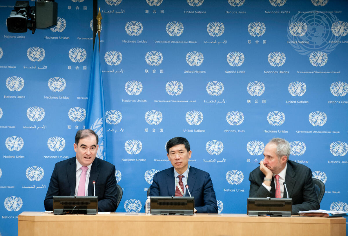 John Ging (left), Director of Operations, UN Office for the Coordination of Humanitarian Affairs (OCHA), briefs journalists with Haoliang Xu (centre), Assistant Administrator and Director for the Regional Bureau for Asia and the Pacific at the UN Development Programme (UNDP), following their recent trip to Myanmar. Pictured with them: Stéphane Dujarric, spokesperson for the Secretary-General.