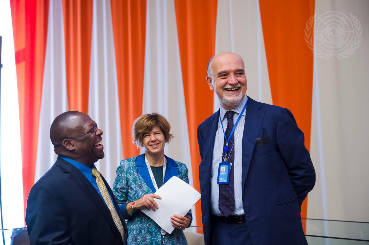 Denis G. Antoine (left), Permanent Representative of Grenada to the United Nations, shares a laugh with Inigo Lambertini (right), Deputy Permanent Representative of Italy to the United Nations, during the high-level discussion on ""Public Spaces for All"", organized by the United Nations Human Settlements Programme (UN Habitat) as part of this year's World Habitat Day celebration.