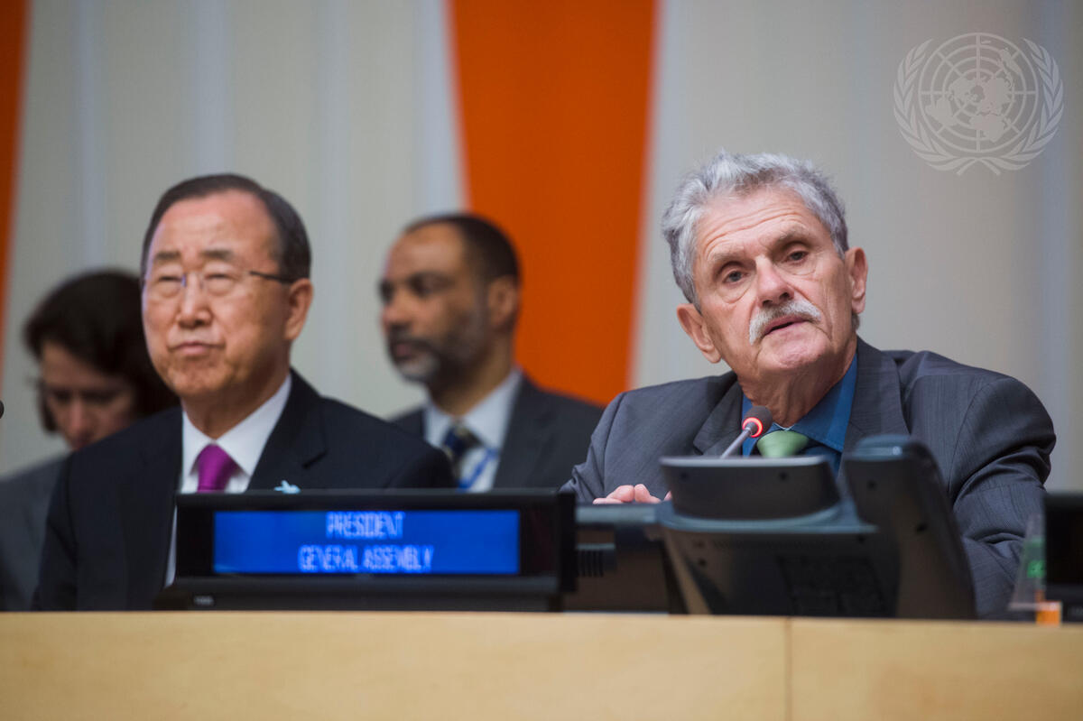 Mogens Lykketoft (right), President of the seventieth session of the General Assembly, speaks at a high-level discussion on ""Public Spaces for All"", organized by the United Nations Human Settlements Programme (UN Habitat) as part of this year's World Habitat Day celebration. Also in attendance is Secretary-General Ban Ki-moon.