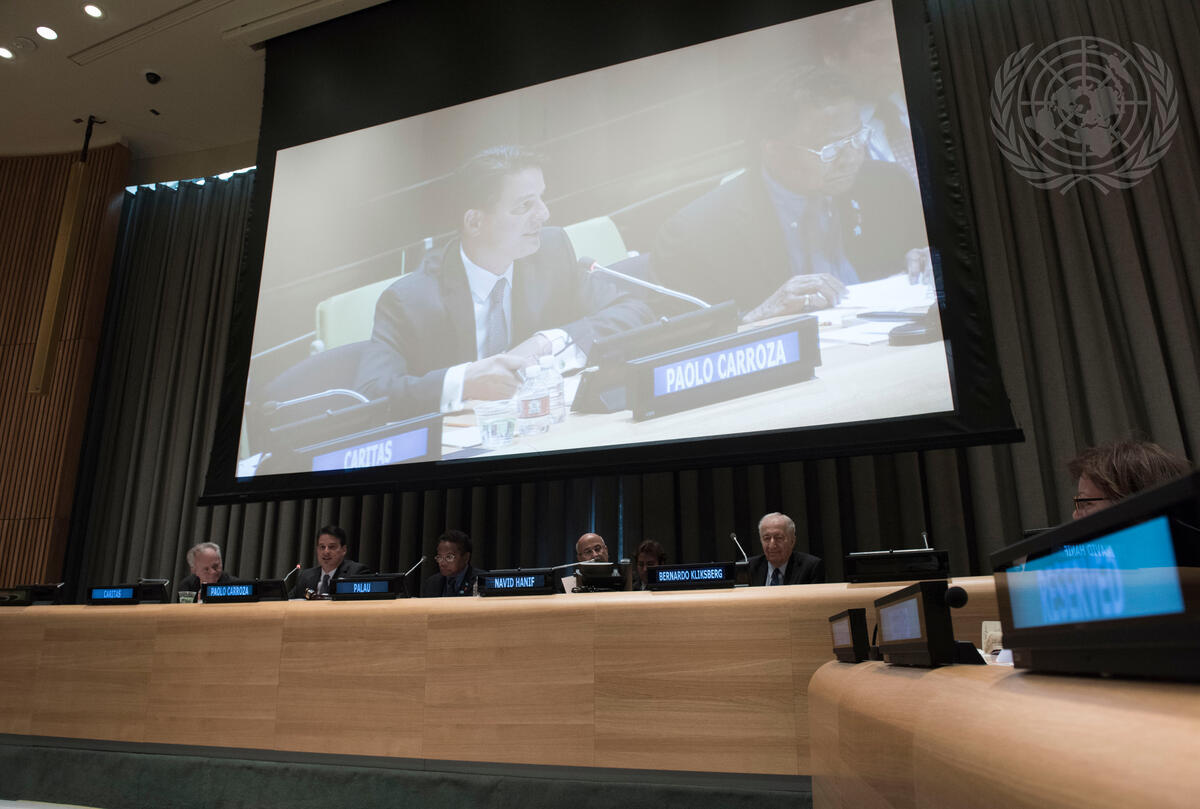 Paolo G. Carozza (on screen), Director of the Kellogg Institute for International Studies of the University of Notre Dame, speaks at an event on “Ethics for Development”. The event was co-organized by the Permanent Missions of Argentina, Kazakhstan, Palau and Panama to the United Nations.