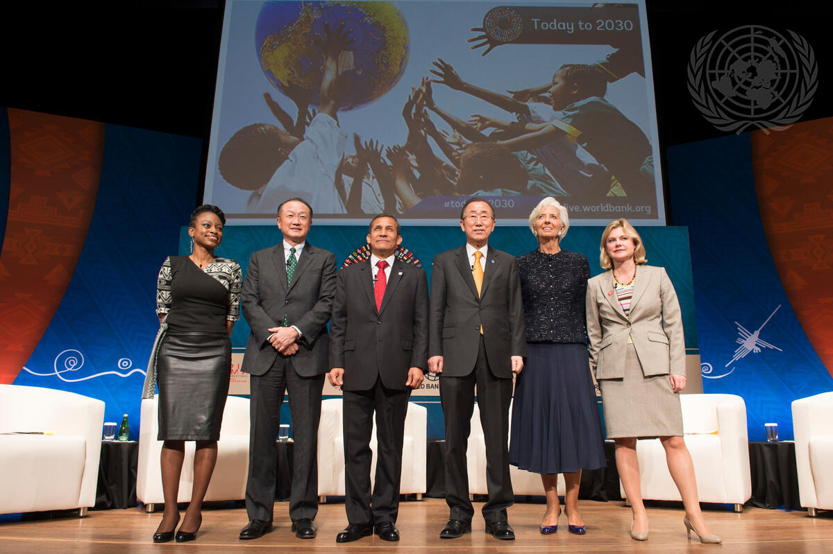 Secretary-General Ban Ki-moon delivers a speech at Interactive Panel Discussion entitled ""From Today to 2030"". Standing, from left to right, are the Moderator Femi Oke, international television host and journalist; Jim Yong Kim, President of the World Bank Group; Ollanta Humala Tasso, President of Peru, the Secretary-General; Christine Lagarde, Managing Director International Monetary Fund; and Justine Greening, Minister, Secretary of State for International Development, United Kingdom. The event is part of the 2015 Annual Meetings of the Boards of Governors of the World Bank Group (WB) and the International Monetary Fund (IMF) in Lima, Peru.