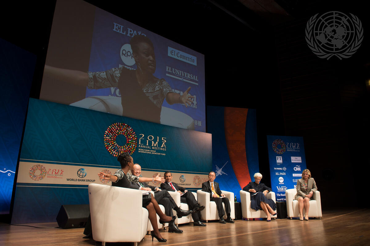 Secretary-General Ban Ki-moon at the Interactive Panel Discussion entitled ""From Today to 2030"". At the panel, from left to right, are Moderator Femi Oke, international television host and journalist; Jim Yong Kim, President of the World Bank Group; Ollanta Humala Tasso, President of Peru, the Secretary-General; Christine Lagarde, Managing Director International Monetary Fund; and Justine Greening, Minister, Secretary of State for International Development, United Kingdom. The event is part of the 2015 Annual Meetings of the Boards of Governors of the World Bank Group (WB) and the International Monetary Fund (IMF) in Lima, Peru.