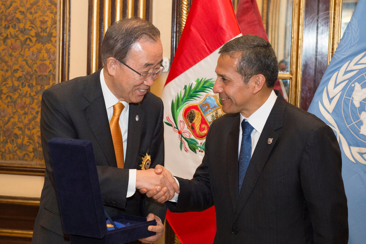 Secretary-General Ban Ki-moon (left) meets with Ollanta Humala Tasso (right), President of Peru, during his trip to attend the 2015 Annual Meetings of the Boards of Governors of the World Bank Group (WB) and the International Monetary Fund (IMF) in Lima, Peru. The Secretary- General is presented with a medal honour from the Peruvian Parliament.