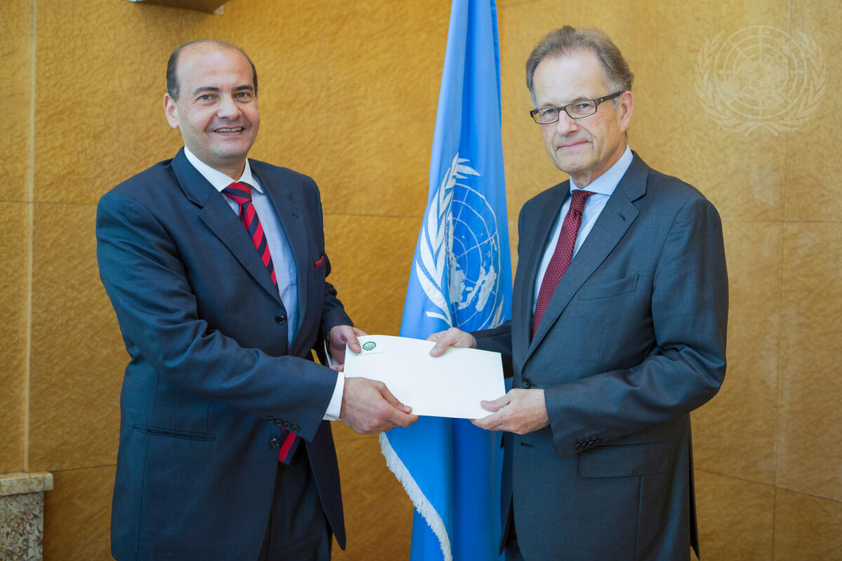 Sameh Aboulenein (let), new Permanent Observer of the League of Arab States to the United Nations Office at Geneva (UNOG), presents his credentials to Michael Møller, Director-General of UNOG.