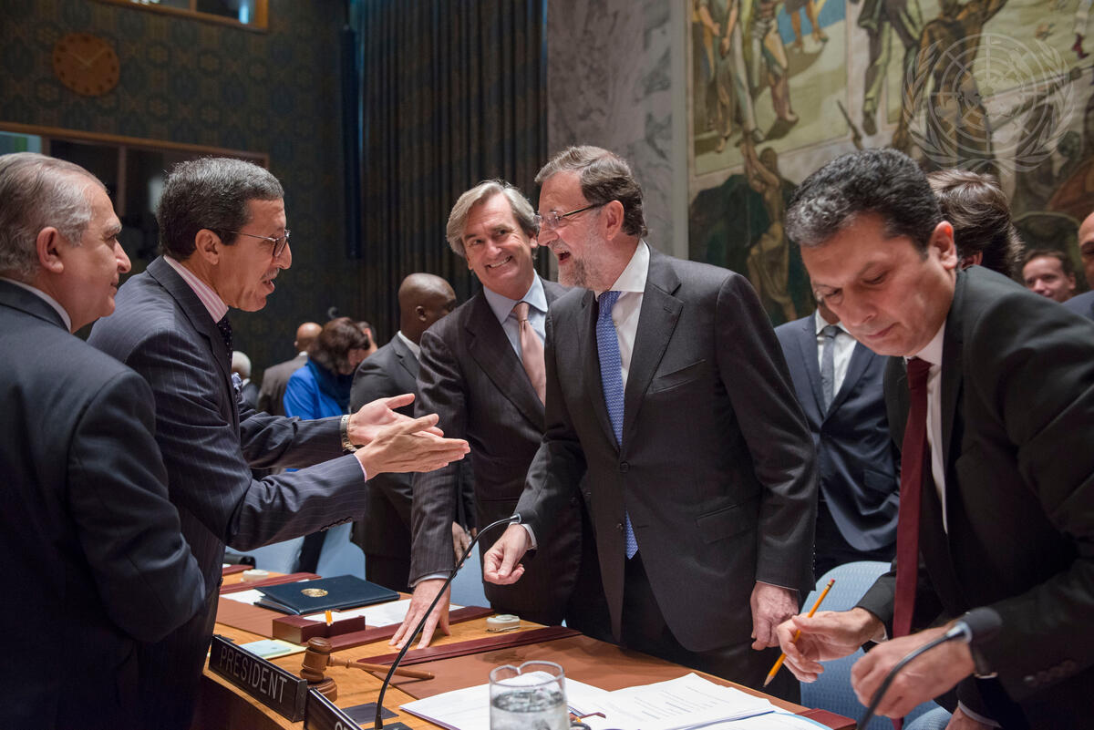 Mariano Rajoy Brey (centre right), Prime Minister of Spain and President of the Security Council for October, greets Omar Hilale, Permanent Representative of Morocco to the UN, at the debate. Also pictured: Mohamed Ali Alhakim (left), Permanent Representative of Iraq; Román Oyarzun Marchesi (centre left), Permanent Representative of Spain; Movses Abelian (right), Director of the Security Council Affairs Division.