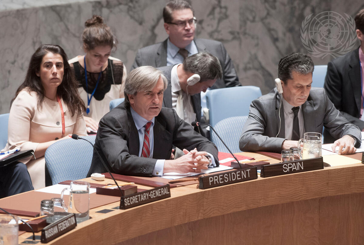Román Oyarzun Marchesi (front left), Permanent Representative of Spain to the UN and President of the Security Council for October, chairs the Council’s meeting on the situation in Mali.