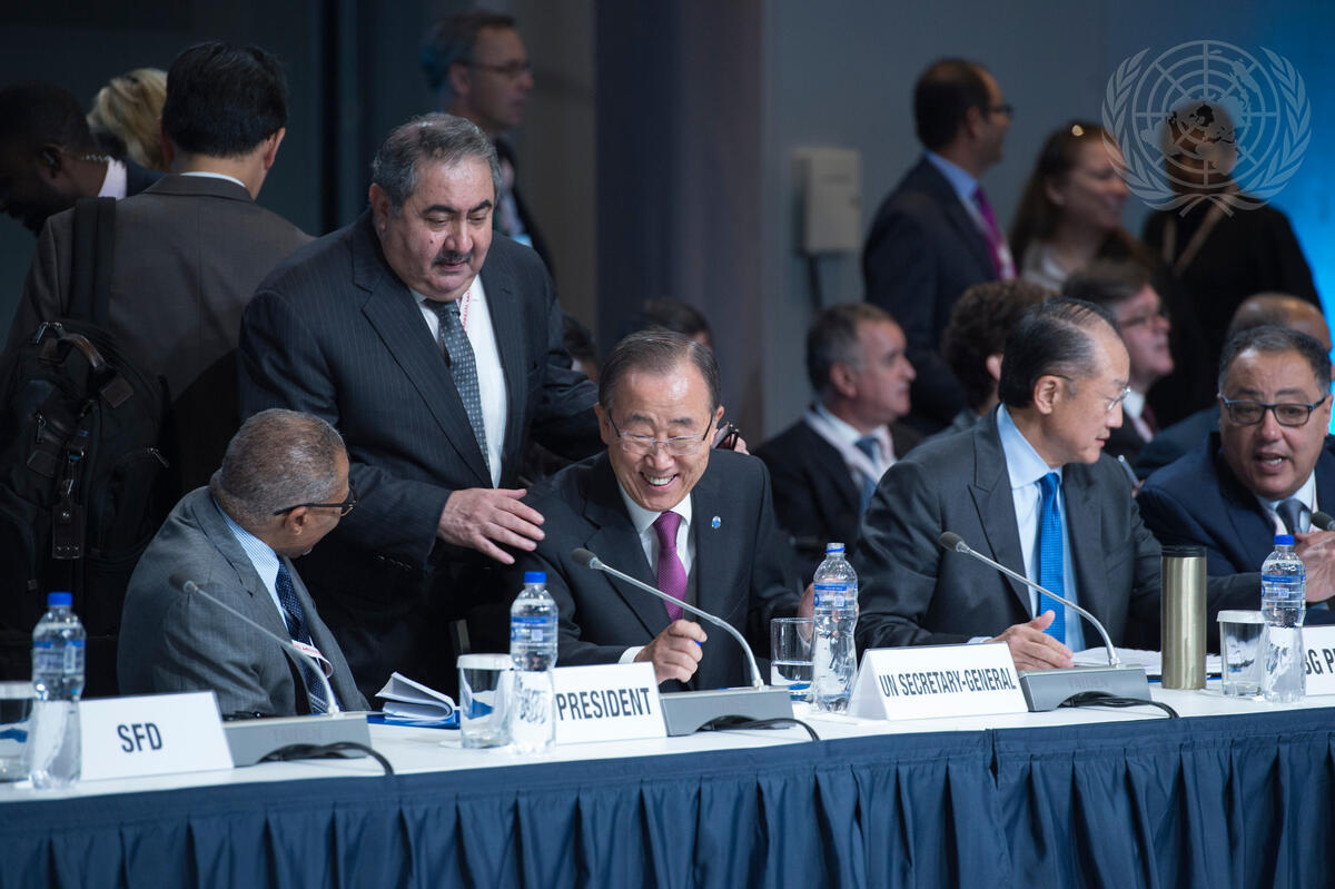 Secretary-General Ban Ki-moon (center) greeted by Hoshyar Zebari (standing), Deputy Prime Minister and Finance Minister of Iraq at the International Stakeholder Roundtable meeting for the Middle East and North Africa region (MENA) in Lima, Peru.