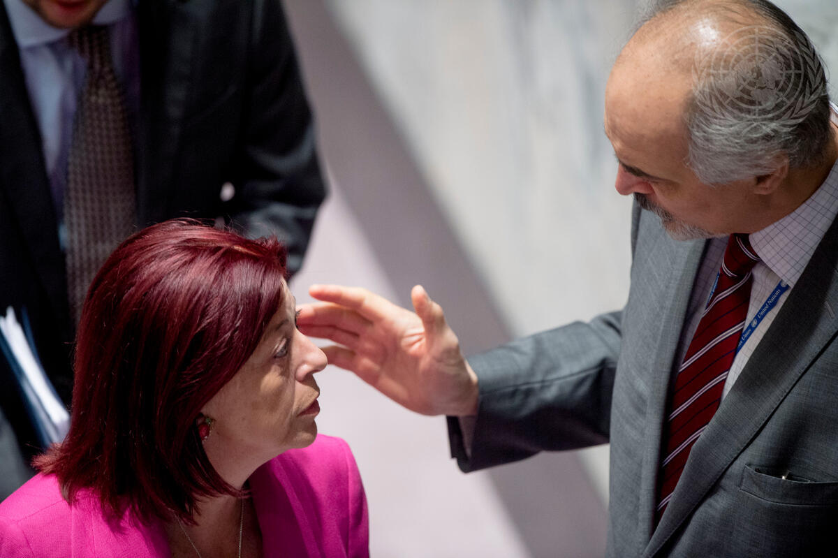 María Cristina Perceval (left), Permanent Representative of Argentina to the UN and President of the Security Council for October, speaks with Bashar Ja’afari, Permanent Representative of the Syrian Arab Republic to the UN, following the Security Council meeting on the situation in the Middle East.