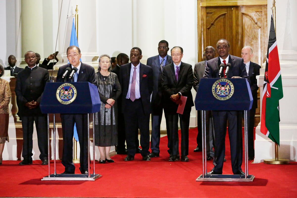 Secretary-General Ban Ki-moon (at left lectern) holds a joint press conference with Uhuru Kenyatta (at right lectern), President of the Republic of Kenya, at State House in Nairobi, Kenya.