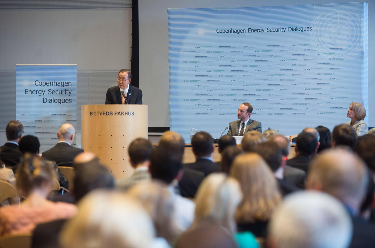 Secretary-General Ban Ki-moon (at lectern) delivers the keynote address at the opening session of the Copenhagen Energy Security Dialogues, in Denmark.