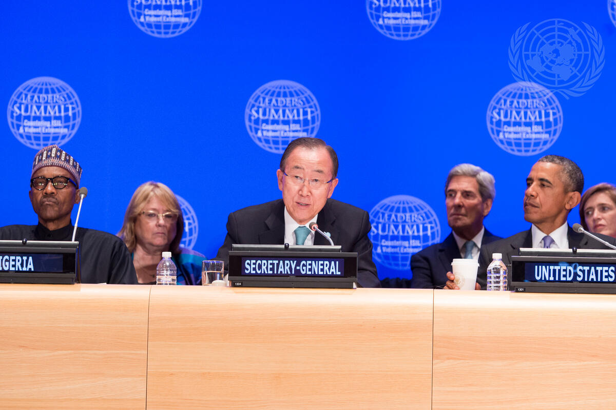 Secretary-General Ban Ki-moon addresses a Leaders’ Summit on Countering Violent Extremism, chaired by United States President Barack Obama (second from right) on the margins of the General Assembly general debate. Also pictured (from left): Muhammadu Buhari, President of Nigeria; Susana Malcorra, Chef de Cabinet to the Secretary-General; United States Secretary of State John Kerry; and Samantha Power, United States Permanent Representative to the UN.