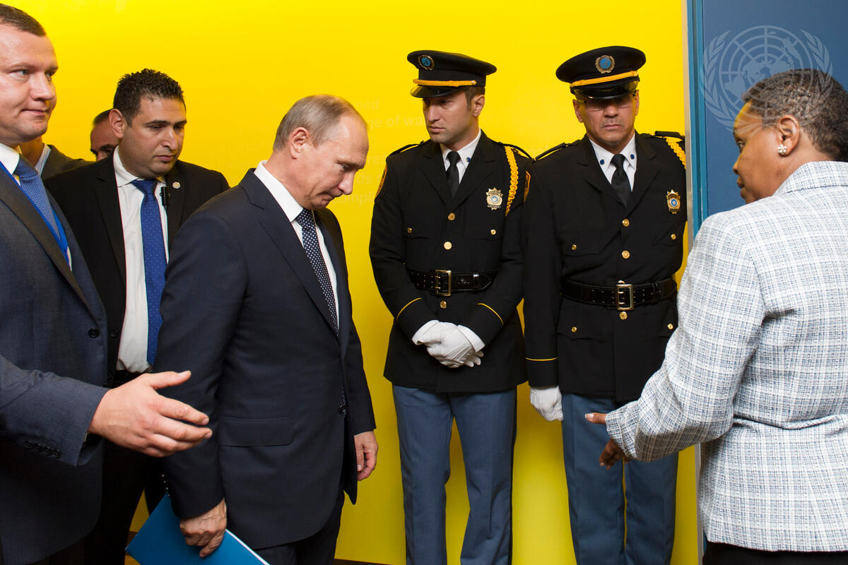 Vladimir Putin (centre left), President of the Russian Federation, on his way to the General Assembly Hall to address the Assembly’s general debate.