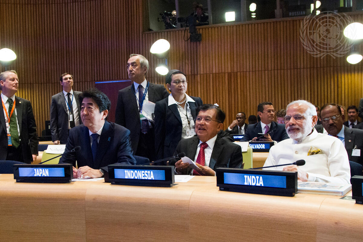 From left to right, seated: Shinzo Abe, Prime Minister of Japan; Muhammad Jusuf Kalla, Vice-President of the Republic of Indonesia; and Narendra Modi, Prime Minister of India.