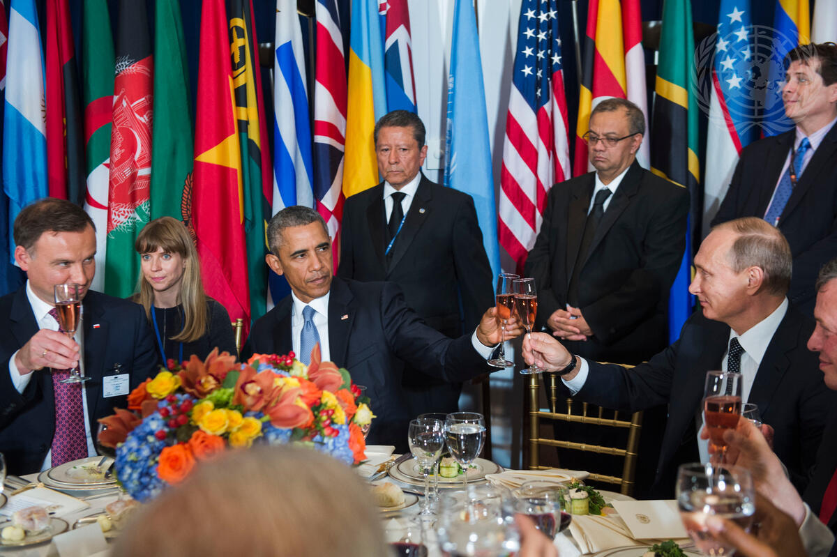 United States President Barack Obama (third from left) and Vladimir V. Putin (second from right), President of the Russian Federation, share a toast at a luncheon hosted by Secretary-General Ban Ki-moon in honour of world leaders attending the general debate of the General Assembly. Also pictured: Andrzej Duda (left), President of the Republic of Poland.