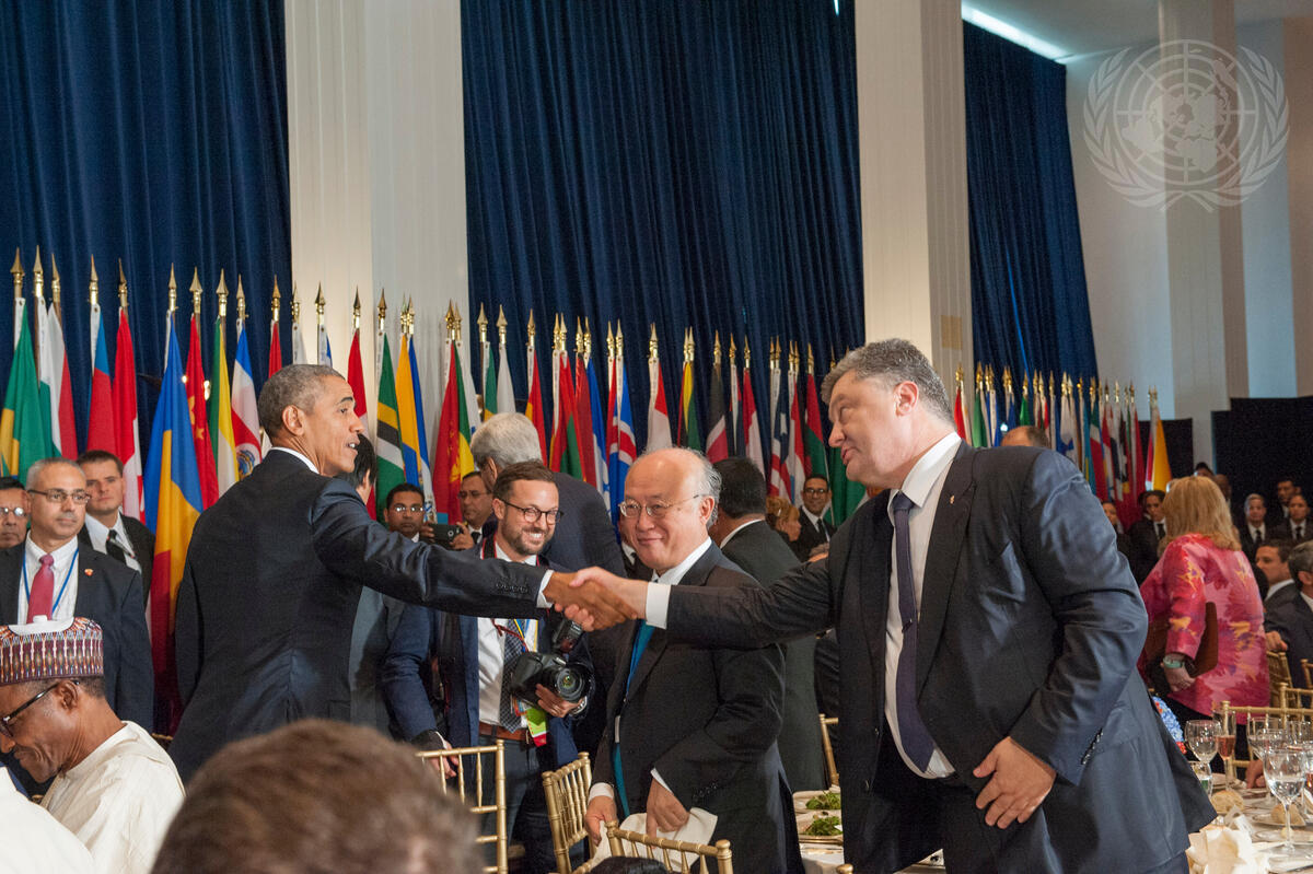 United States President Barack Obama (left) greets Petro Poroshenko, President of Ukraine, as Yukiya Amano (centre right), Director-General of the International Atomic Energy Agency (IAEA), looks on.